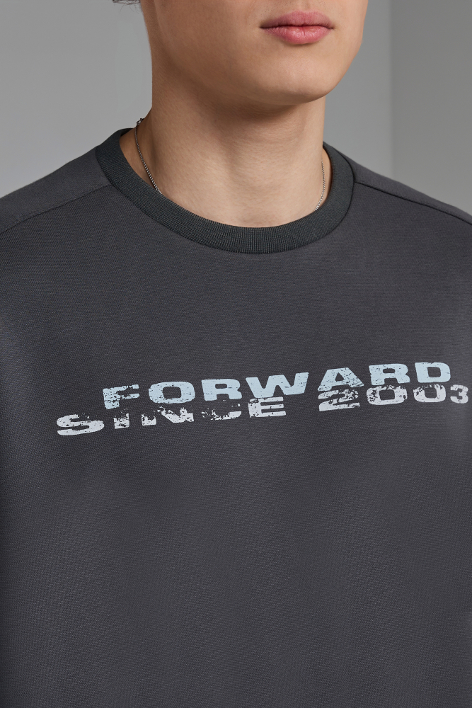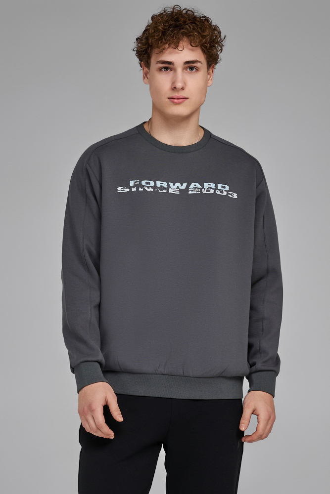 Толстовка из трикотажного полотна прямого силуэта. Горловина О-образной формы. Рукава втачные. Горловина, манжеты и пояс выполнены из трикотажного полотна ластик. Нанесения: принт «FORWARD since 2003», принт. Состав: ткань верха: 31%хлопок, 62% полиэстер, 7% эластан. 335 г/м2
